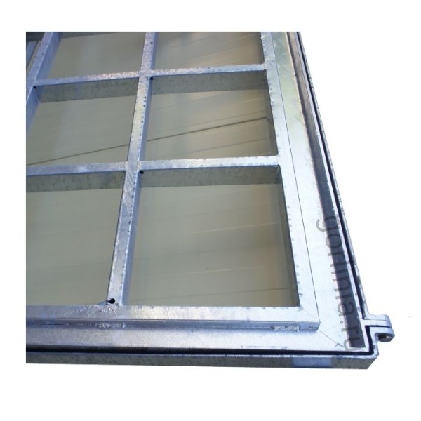 Рама исполнена из сортового уголка 50х5. Каркас двери с внешним кантом сварен с обвязкой профилем 50х25 с ячейкой в осях 300х300. Дно крышки закрыто оцинкованным листом 2 мм клепочным соединением с расчетной глубиной под настил декинга.