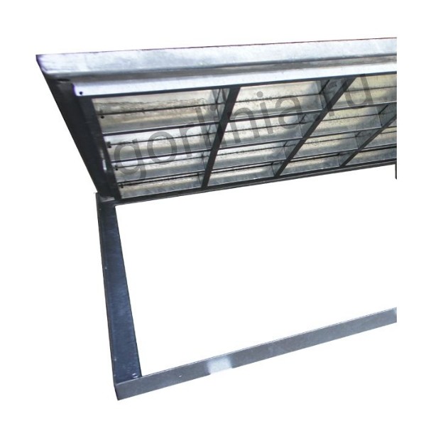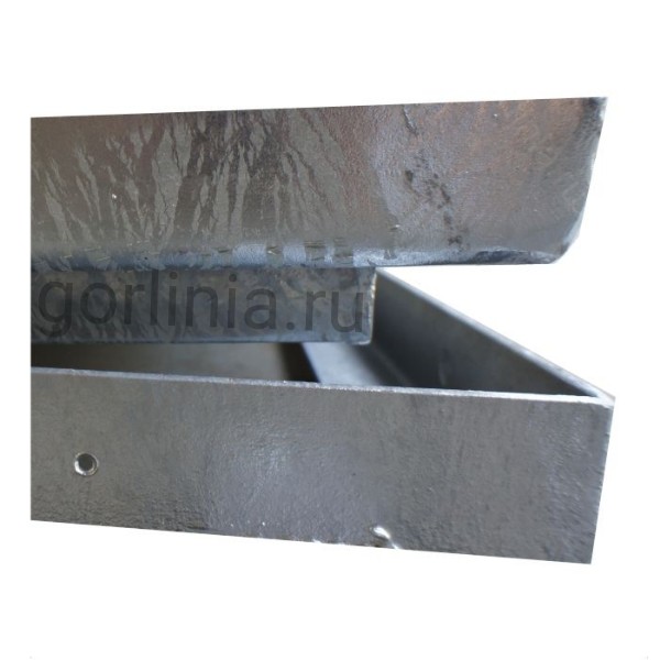 Рама сварена из сортового уголка 50х5. Каркас двери с внешним кантом выполнен в обвязкой из профиля 50х25 с ячейкой в осях 300х300. Дно крышки закрыто оцинкованным листом 2 мм с расчетной глубиной 20 или 30 мм в зависимости от толщины доски декинга. Элемент петли реализован выносными разъемными шарнирами.