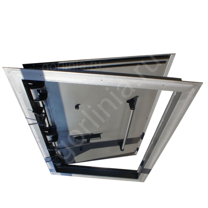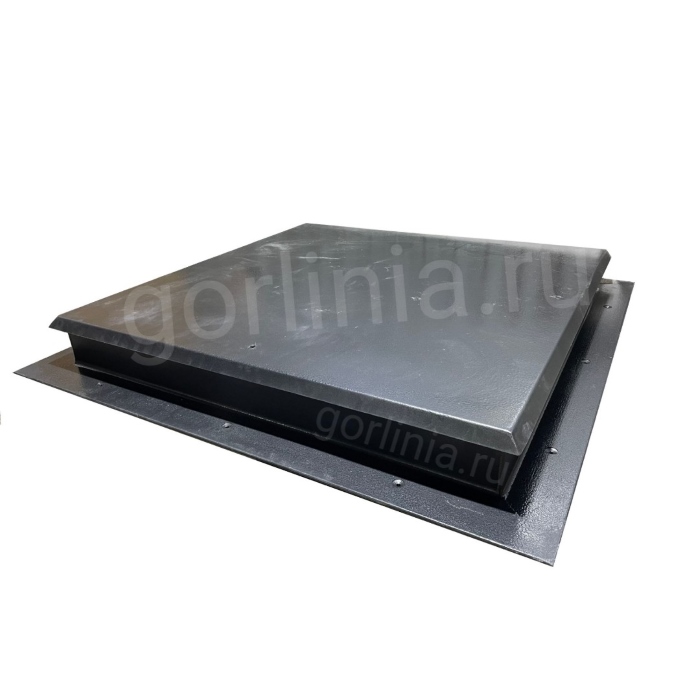 Откидная крышка закрыта сверху гладким стальным листом с загнутыми краями (вылет металлической части за габарит рамного основания 30 мм). Внутрь каркаса между обвязкой заправлен минеральный утеплитель 50 мм, подшит снизу листом 1 мм. В раме по притвору проложено 2 контура уплотнительной резины.