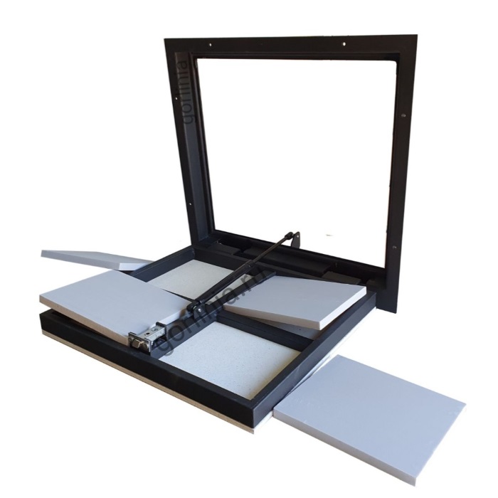 Детали каркаса выполнены из стального проката 3 мм. Крышка обвязана трубой 30х20 в комбинированном положении. Заполнение дверцы - ГВЛ под скрытую облицовку керамической плиткой по принципу невидимки.