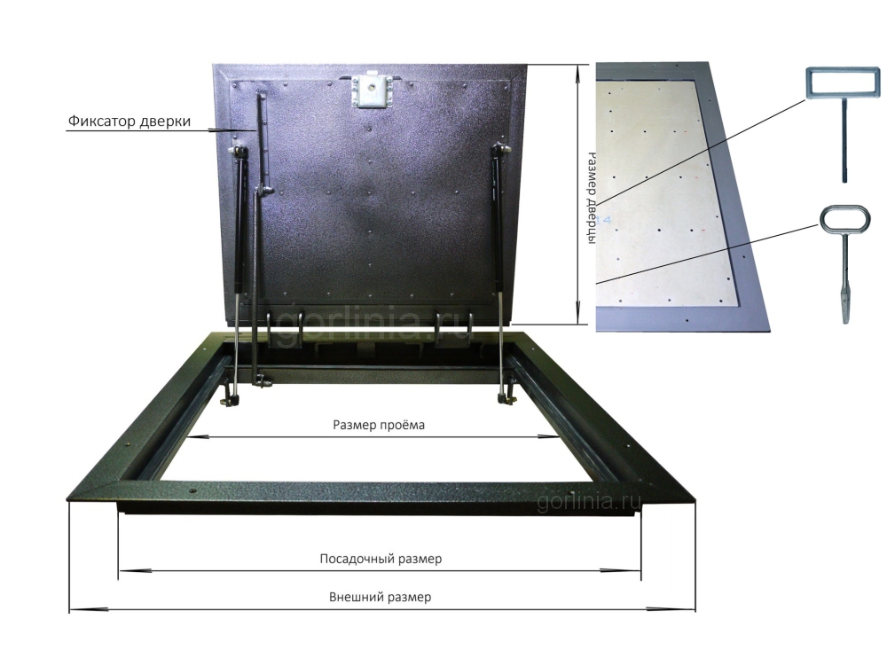 Створка в сэндвиче из стального листа обшита плитой ГВЛВ в уровень с наличником, все элементы фурнитуры (замок, газлифты, шарниры) скрыты внутри: верхняя лицевая часть подготовлена под финишной отделку плиткой/ламинатом с отступами и зазорами по схеме завода-изготовителя.